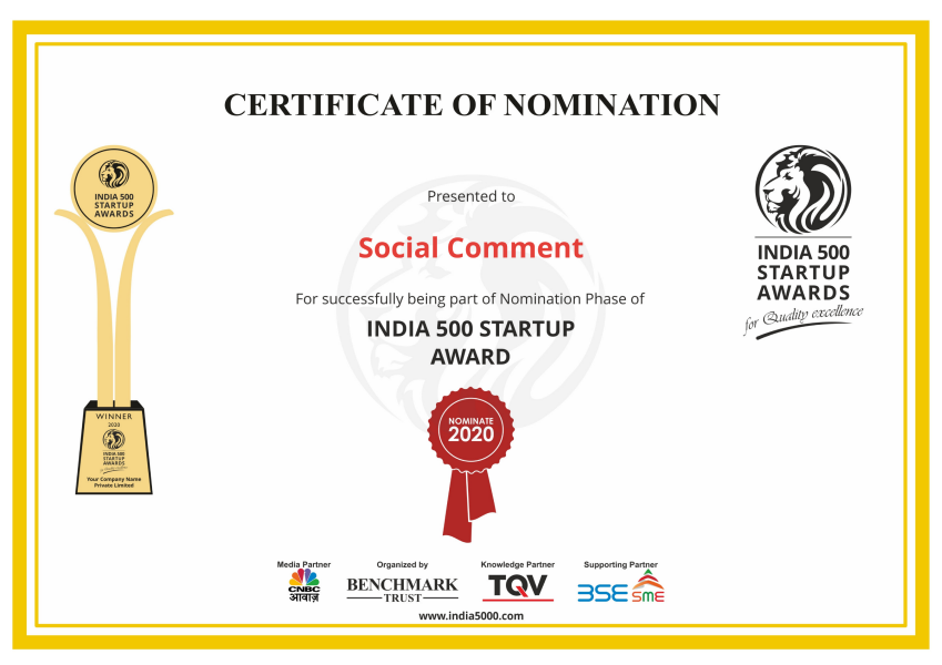 Our company was nominated as a most promising technology startup by India 500 Startup Awards for quality of excellence. Benchmark trust organized the event, which included Media partner CNBC Awaaz, Supporting partner Bombay stock exchange, and Knowledge partner TQV.